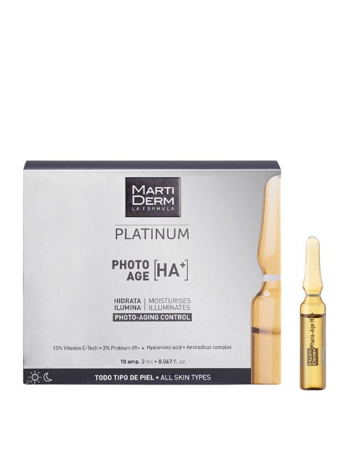 Photo Age HA+ es el resultado de la sinergia entre la vitamina C, el Proteum 89+ y el ácido hialurónico. Se trata de una ampolla de fácil absorción que hidrata e ilumina la piel, además de suavizar la apariencia de las arrugas logrando un rostro más firme. Con un 15 % de Vitamina C-Tech, un 3 % de Proteum 89+y Ácido Hialurónico de bajo peso molecular, Antiradical Complex y Repair Complex, consigue prevenir y reducir los signos del fotoenvejecimiento como líneas de expresión, arrugas, manchas y pérdida de firmeza, protegiendo además la piel de las agresiones diarias por su poder antioxidante.