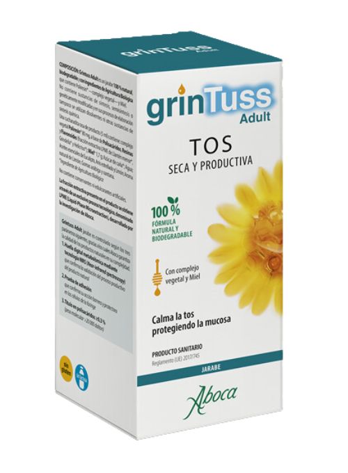 Grintuss Adult es un jarabe que actúa tanto en la fase de tos seca, contrarrestando la inflamación de la mucosa, como en la fase con moco, favoreciendo su hidratación y su eliminación de las vías respiratorias superiores. Grintuss Adult, a base de Poliresin® -complejo vegetal- y Miel, tiene una fórmula de origen 100 % natural, biodegradable y con ingredientes de Agricultura Biológica.
