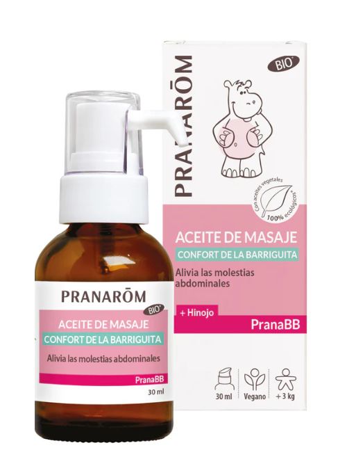 El aceite de masaje Confort de la barriguita está indicado para un masaje reconfortante del bebé durante la digestión. Está enriquecido con aceites esenciales de hinojo, jengibre, naranja dulce y hierbabuena, que aportan bienestar a los más pequeños durante la digestión. Además, contiene aceites vegetales de coco, almendras dulces y girasol, que nutren y protegen la piel sensible del bebé.