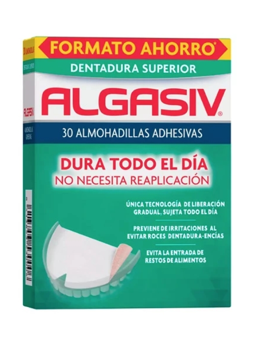 MODO DE EMPLEO: Humedecer la almohadilla y colocarla en la dentadura superior. Algasiv, insípida e inodora, es fácil de quitar y no deja residuos.