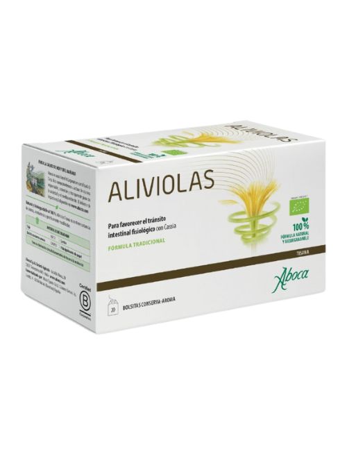 Aliviolas Tisana resulta útil para favorecer el tránsito intestinal fisiológico y actúa respetando el intestino gracias a la sinergia de: