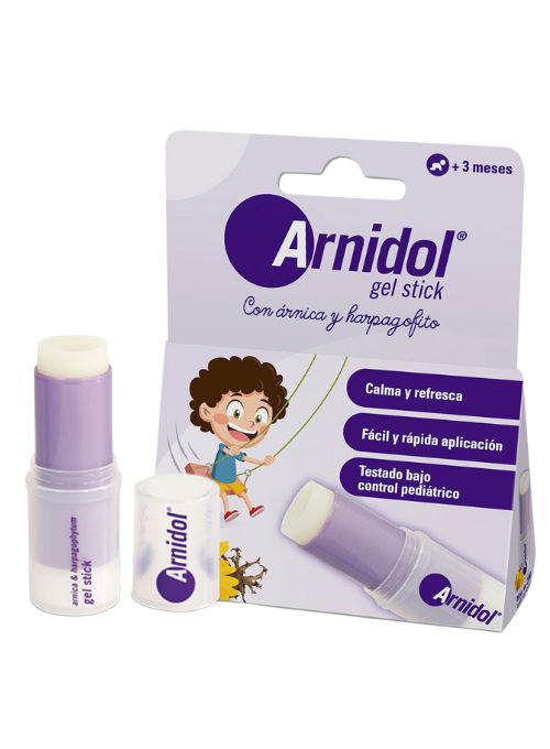 Arnidol gel stick, gracias a sus ingredientes, Árnica y Harpagofito, de origen natural; refresca y reconforta la piel después de los pequeños golpes de los niños.