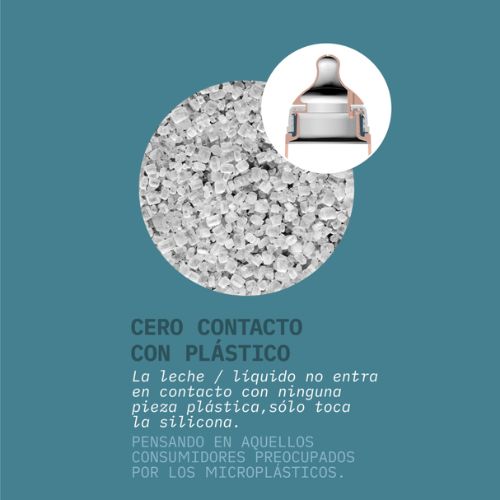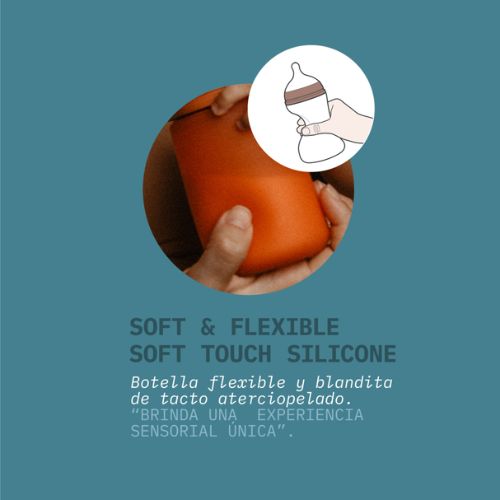 La botella suave y flexible de silicona, con un tacto suave y aterciopelado, brinda una experiencia sensorial única. Su tratamiento de Foto-Oxidación minimiza la adhesión de pelusas y partículas de suciedad a la botella, para una mayor higiene. SIN ADITIVOS. NO-TÓXICO. Cero contacto con plástico. La leche/líquido no entra en contacto con ninguna pieza de plástico, solo toca la silicona. Pensado para aquellas familias preocupadas por los microplásticos.