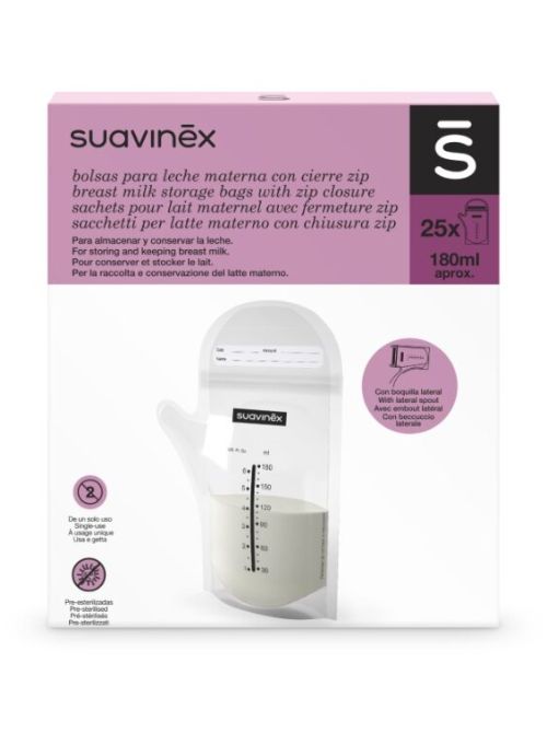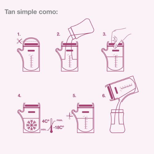- Boquilla lateral recortable, facilita el manipulado de la leche y evita derrames al trasvasar la leche de la bolsa al biberón.