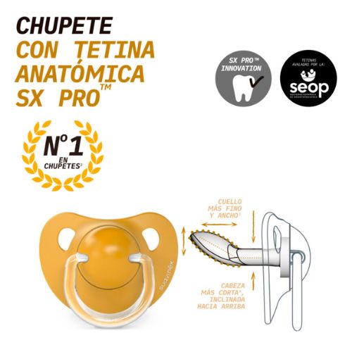La tetina anatómica SX Pro deja a la lengua más espacio en la cavidad bucal para que la succión sea lo más natural posible. Chupete de forma anatómica, que simula la forma de bóveda que forman el paladar y la lengua: paladar, convexo por arriba y lengua, plana por debajo. La Tetina Suavinex SX Pro está Avalada por la Sociedad Española de Odontopediatría.