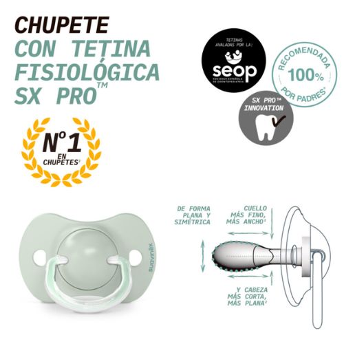 Chupete de forma fisiológica, la más recomendada por Odontopediatras que deja más espacio a la lengua en la cavidad bucal. Es reversible por lo que no hay problema si el bebé le da la vuelta. La nueva tetina Fisiológica SX Pro está pensada para no invadir la cavidad oral y proporcionar al bebé la misma sensación que experimenta en su estado natural/fisiológico cuando no lleva chupete. Creada teniendo en cuenta las particularidades bucodentales del bebé, cuyo maxilar y mandíbula están en pleno desarrollo. La Tetina Suavinex SX Pro está Avalada por la Sociedad Española de Odontopediatría y recomendada por la Asociación Italiana de Especialistas en Ortodoncia.