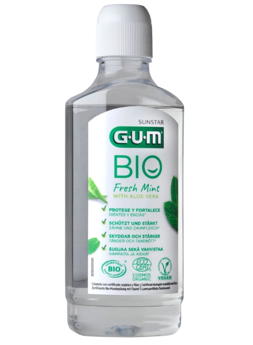 También hemos incluido en su formulación un ingrediente activo clave: nuestro colutorio natural contiene la cantidad idónea de flúor para proteger tus dientes frente a la caries y fortalecer tu esmalte. Con esto, cumplimos con las recomendaciones de la Federación Europea de Periodoncia (EFP por sus siglas en inglés). Utilízalo junto al dentífrico GUM BIO para prevenir la acumulación de las bacterias responsables de la placa y la enfermedad periodontal.
