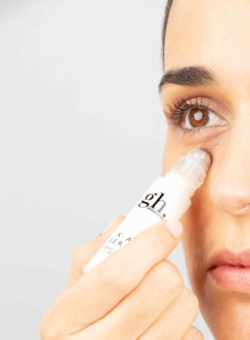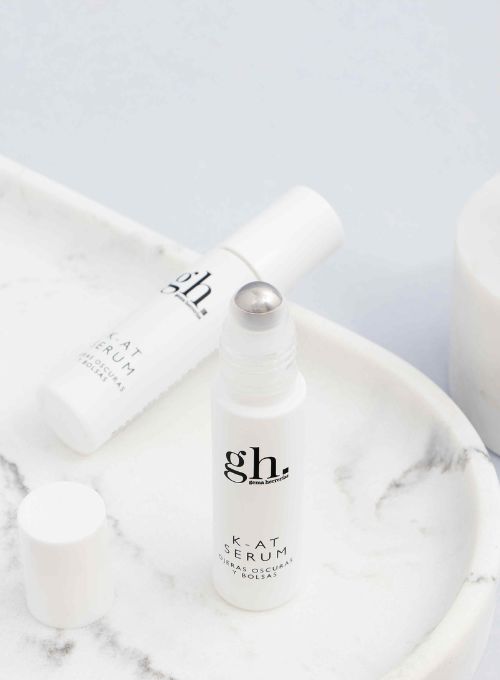 gh K-AT serum ojeras oscuras y bolsas está formulado con vitamina K óxido para aclarar ojeras vasculares, ácido tranexámico para reducir ojeras pigmentarias y un complejo encapsulado en niosomas que contienen diosmina, forskolin y palmitoyl tetrapeptide-7 para reducir la apariencia de las bolsas.