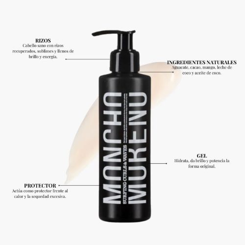 Gel de definición de rizos que potencia su forma y elasticidad a base de ingredientes y aceites naturales: aguacate, coco, mango y leche de coco.