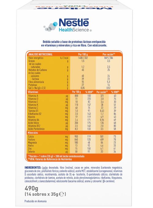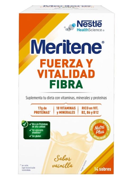 Meritene FUERZA Y VITALIDAD es una solución nutricional en formato polvo para diluir y obtener un delicioso batido. Su fórmula NutriPlus contiene proteínas, de alta calidad, y 19 vitaminas y minerales. Sus ingredientes permiten suplementar la dieta, contribuyen a disminuir el cansancio y la fatiga y al funcionamiento normal del sistema inmunitario.