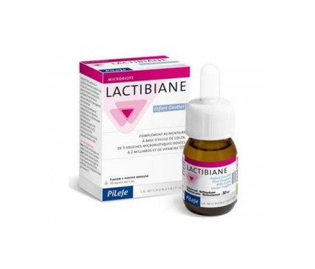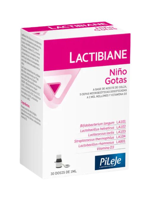 Lactibiane Niños Gotas es un complemento alimentario destinado a aportar a los niños 5 cepas microbióticas específicas, dosificadas a 2000 millones por dosis.