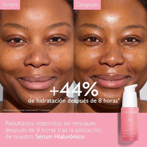 El Sérum Hialurónico VinoHydra capta el agua intensamente y la difunde de manera continua durante todo el día. Restablece el equilibrio hídrico de la epidermis para que la piel esté repleta de agua y calmada, flexible y suave.