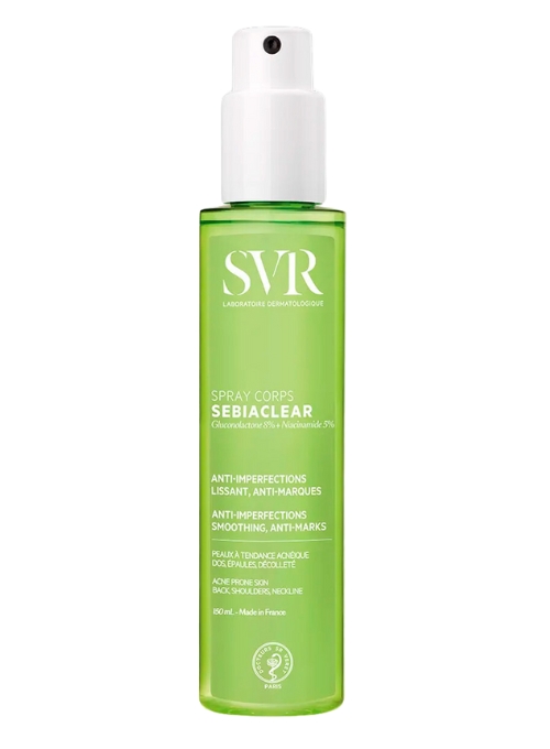 Su fórmula corrige todas las imperfecciones de la espalda, los hombros y el escote. SEBIACLEAR Spray Corps reduce en un 40 % los granos en tan sólo 2 semanas. Reduce las imperfecciones y previene su reaparición, alisa la textura de la piel y reduce las marcas causadas por el acné.