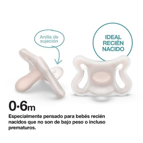 Gracias al tamaño y peso reducido de este chupete de recién nacido, se obtiene una mayor adaptabilidad a la carita del bebé, y su cuello fino y cabeza plana ayuda a respetar el desarrollo bucodental del bebé. La tetina fisiológica SX Pro de forma simétrica respeta la posición natural de la lengua durante la succión