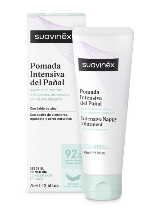 Pomada intensiva del pañal Suavinex, ayuda a calmar las irritaciones del bebé y a restaurar la barrera cutánea. Cuidado intenso para pieles muy sensibles y con alta tendencia a la irritación. Formato 75ml, con textura pomada untosa. 89% de ingredientes de origen natural.