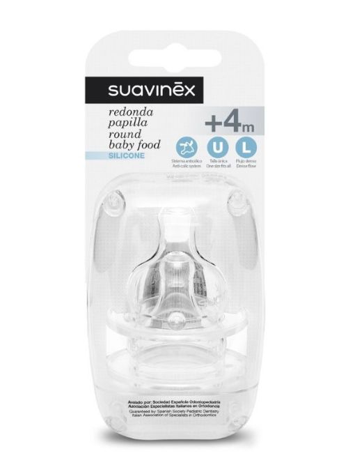Tetina redonda papilla para biberón de boca ancha. Sistema anticólico, talla única, flujo denso. Apto a partir de 4 meses.