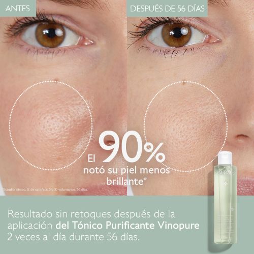 El Tónico Vinopure minimiza los poros, reduce las imperfecciones y matifica los brillos. La piel queda purificada, matificada, limpia y nítida.