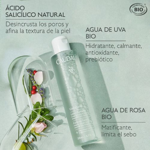 El Tónico Vinopure minimiza los poros, reduce las imperfecciones y matifica los brillos. La piel queda purificada, matificada, limpia y nítida.