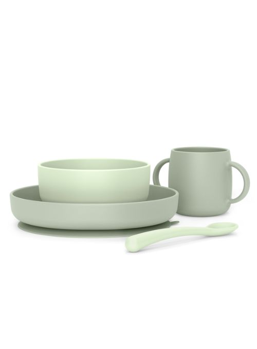 Vajilla de silicona, suave y flexible, de 4 piezas. Para bebés +6 meses. Apta para el lavavajillas.